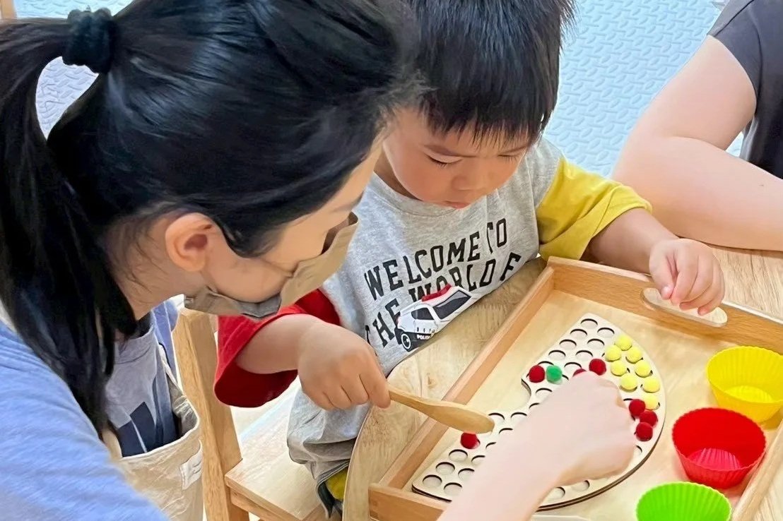 Inside April’s classroom, one child sits at a low table, using tweezers to sort colorful pom-poms into matching bowls; another uses a spoon to scoop coffee beans, listening to the rustling sound they make against the glass; yet another carefully observes a peer, learning through imitation to complete a task independently. This is the daily rhythm of the classroom, showcasing the incredible focus children possess within a prepared environment.