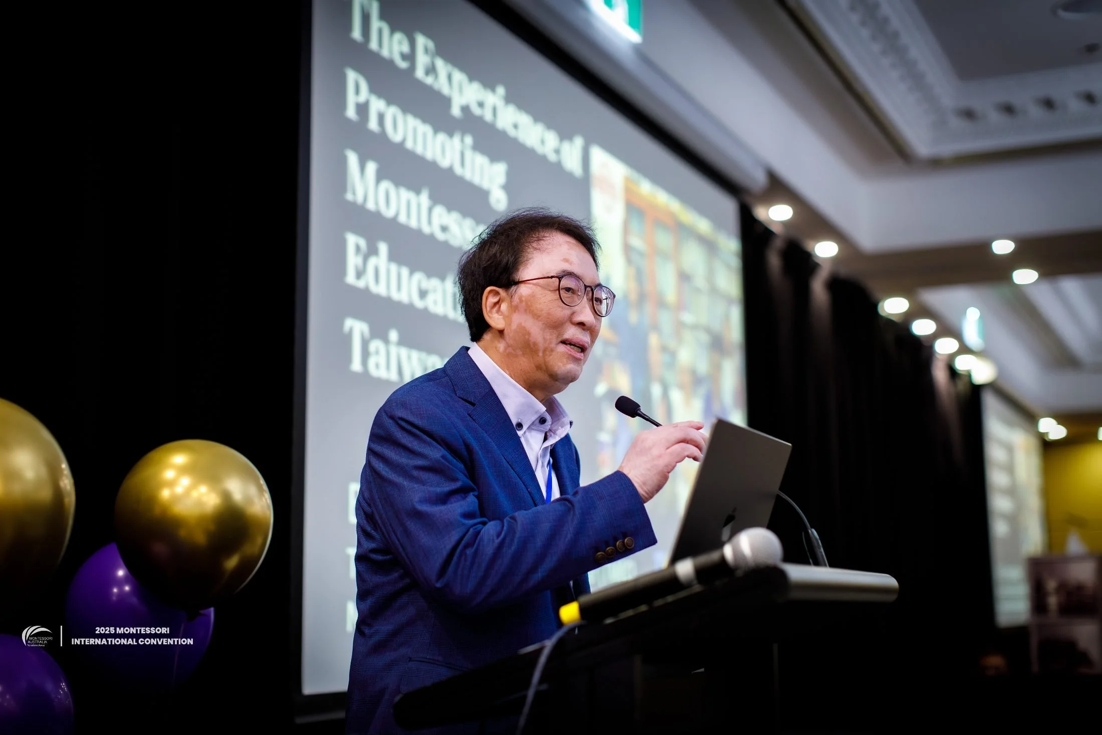 鄭同僚教授在 2025 年 10 月的澳洲蒙特梭利國際大會,與國際友人分享臺灣蒙特梭利教育推廣的實務經驗。