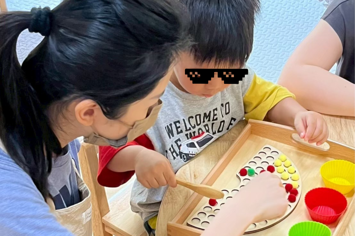 在童等艙蒙特梭利親子教室內,有孩子坐在矮桌前,試圖用鑷子將一顆顆色彩繽紛的毛球歸類到對應顏色的碗裡;有孩子用湯匙舀咖啡豆,聆聽豆子在玻璃罐內沙沙碰撞的聲音;還有孩子小心翼翼地觀察同伴,透過模仿,獨立完成手邊的工作。這是孩子們走進教室的日常,也是他們在「預備好的環境」中展現出的驚人專注力。